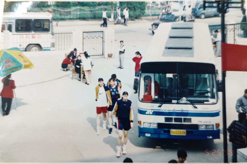 ▲1999年5月25日,到達荊門石化體育館。遠處看女藍隊員走過公交車,個頭真的高。