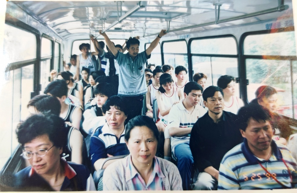 ▲1999年5月25日,僑建隊隊員、教練乘坐公交出行。
