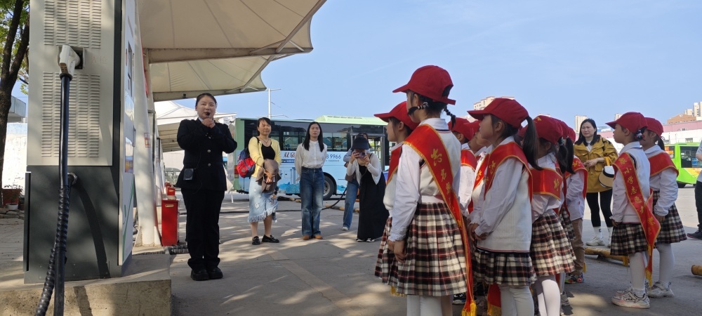 圖/在公交充電站,工作人員向同學(xué)們介紹充電樁的工作原理和純電動(dòng)公交車的運(yùn)行優(yōu)點(diǎn)。
